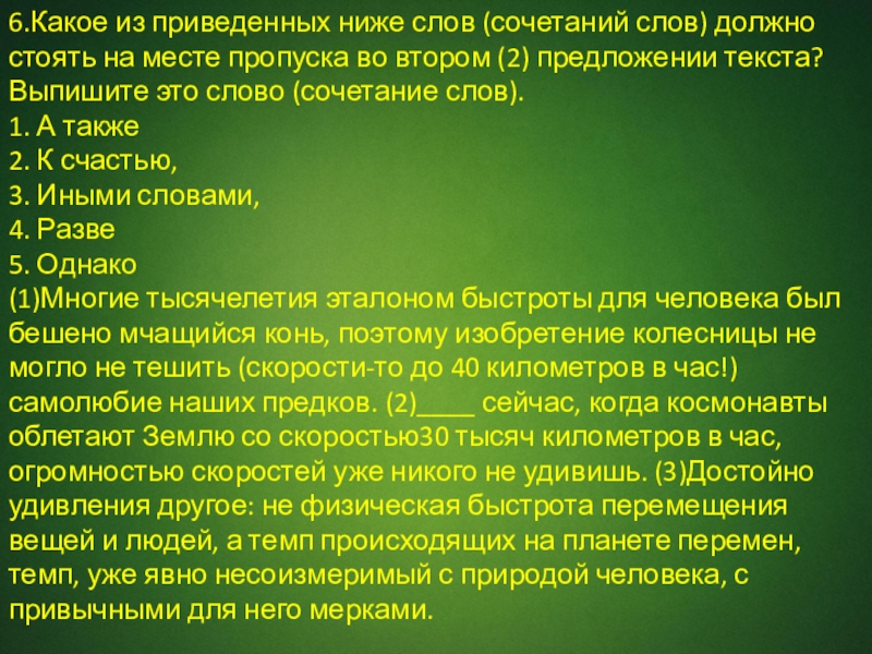 (1)Многие тысячелетия эталоном быстроты для человека был бешено мчащийся конь, поэтому изобретение колесницы не могло не тешить (скорости-то до 40 километров в час!) самолюбие наших предков. (2)____ сейчас, когда космонавты облетают Землю со скоростью30 тысяч километров в час, огромностью скоростей уже никого не удивишь. (3)Достойно удивления другое: не физическая быстрота перемещения вещей и людей, а темп происходящих на планете перемен, темп, уже явно несоизмеримый с природой человека, с привычными для него мерками.