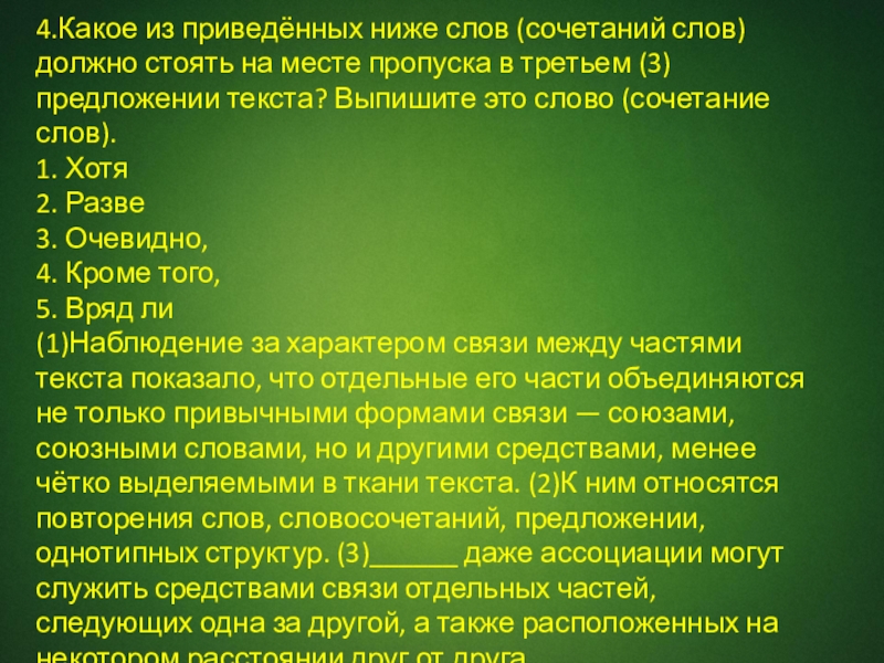 (1)Наблюдение за характером связи между частями текста показало, что отдельные его части объединяются не только привычными формами связи — союзами, союзными словами, но и другими средствами, менее чётко выделяемыми в ткани текста. (2)К ним относятся повторения слов, словосочетаний, предложении, однотипных структур. (3)______ даже ассоциации могут служить средствами связи отдельных частей, следующих одна за другой, а также расположенных на некотором расстоянии друг от друга.