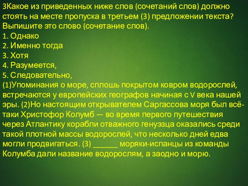 (1)Упоминания о море, сплошь покрытом ковром водорослей, встречаются у европейских географов начиная с V века нашей эры. (2)Но настоящим открывателем Саргассова моря был всё-таки Христофор Колумб — во время первого путешествия через Атлантику корабли отважного генуэзца оказались среди такой плотной массы водорослей, что несколько дней едва могли продвигаться. (3) ______ моряки-испанцы из команды Колумба дали название водорослям, а заодно и морю.