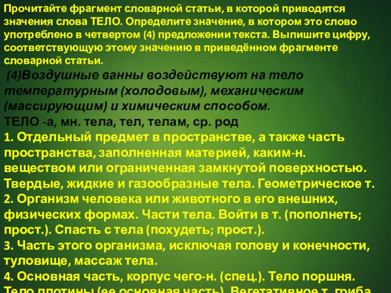 Слайд 7Прочитайте фрагмент словарной статьи, в которой приводятся значения слова ТЕЛО. Определите