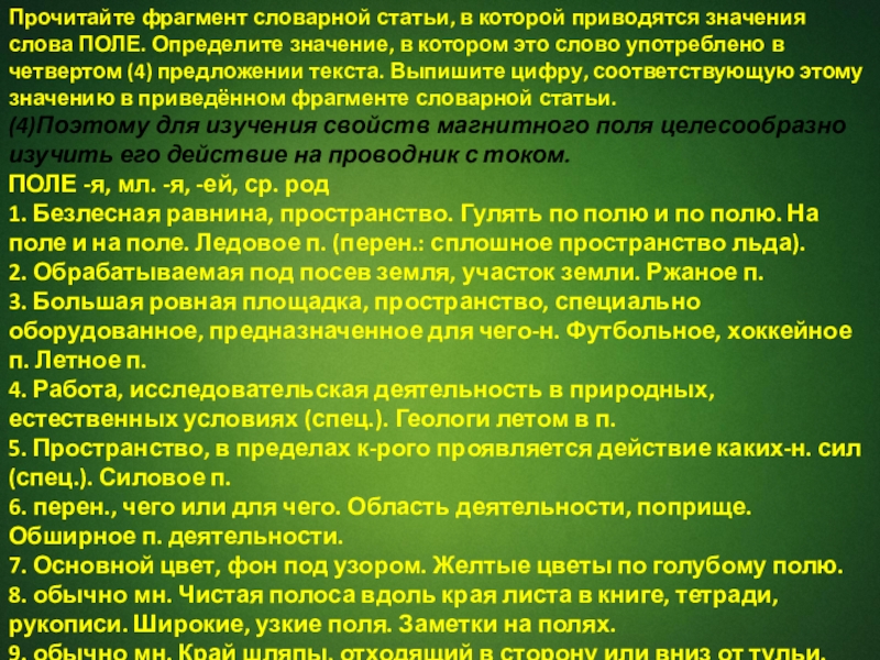 Слайд 8Прочитайте фрагмент словарной статьи, в которой приводятся значения слова ПОЛЕ. Определите