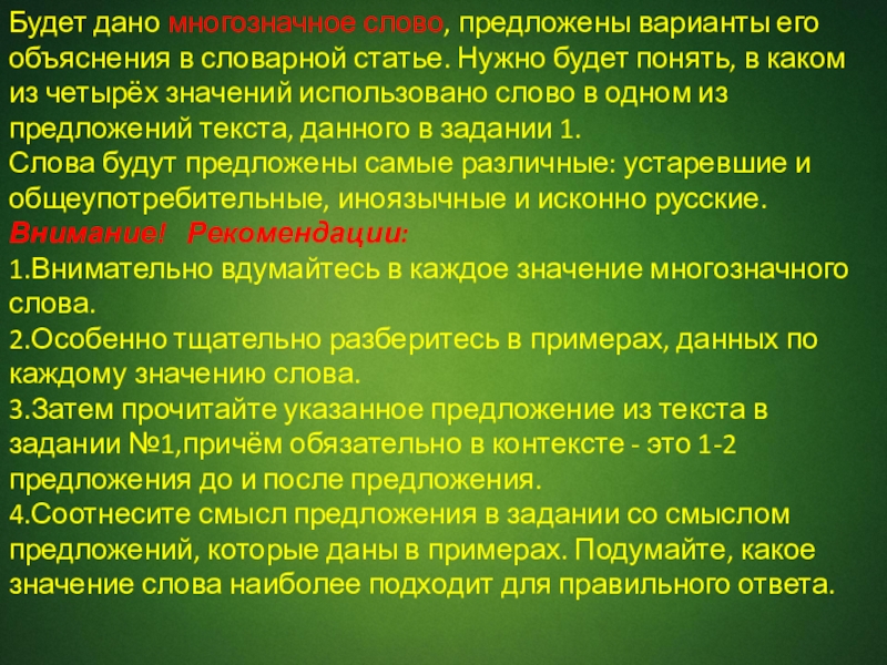 Слайд 3Будет дано многозначное слово, предложены варианты его объяснения в словарной статье.