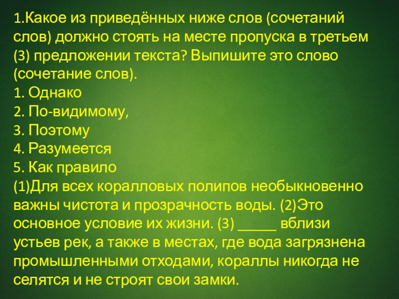 (1)Для всех коралловых полипов необыкновенно важны чистота и прозрачность воды. (2)Это основное условие их жизни. (3) _____ вблизи устьев рек, а также в местах, где вода загрязнена промышленными отходами, кораллы никогда не селятся и не строят свои замки.
