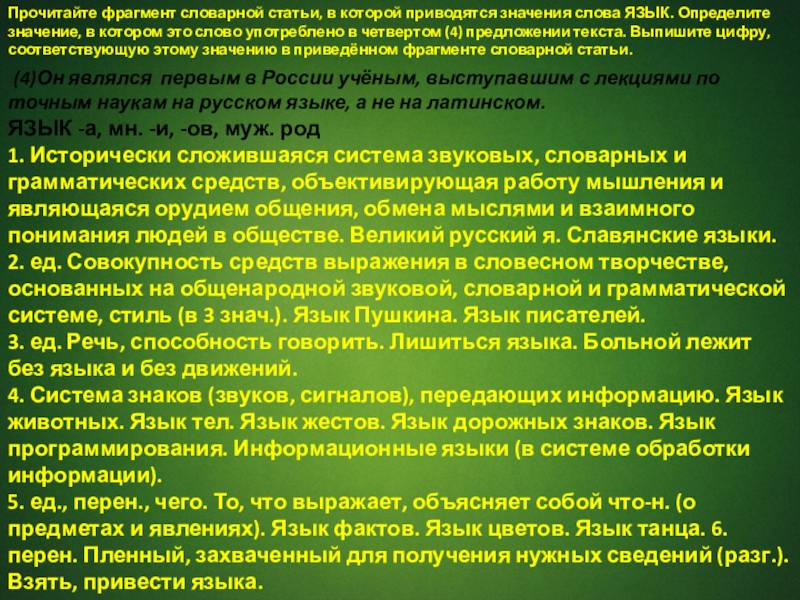 Слайд 5Прочитайте фрагмент словарной статьи, в которой приводятся значения слова ЯЗЫК. Определите