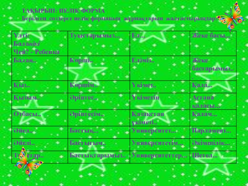 ТАҚЫРЫП: ИЕЛІК ФОРМАБерілген сөздерге иелік форманың жұрнақтарын жалғастырыңдар: