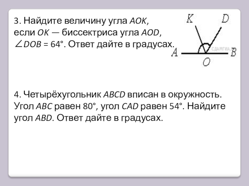4. Четырёхугольник ABCD вписан в окружность. Угол ABC равен 80°, угол CAD равен 54°. Найдите угол ABD. Ответ дайте в градусах.