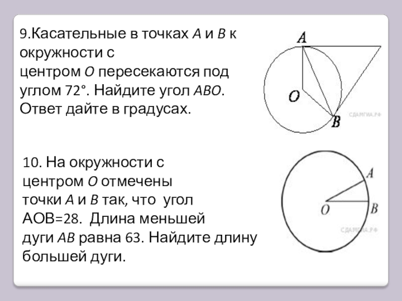10. На окружности с центром O отмечены точки A и B так, что угол АОВ=28. Длина меньшей дуги AB равна 63. Найдите длину большей дуги.