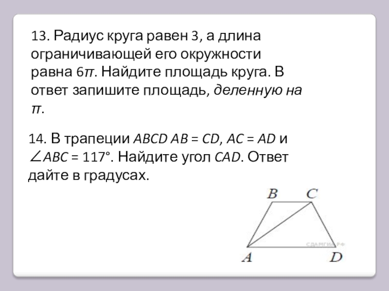 14. В трапеции ABCD AB = CD, AC = AD и ∠ABC = 117°. Найдите угол CAD. Ответ дайте в градусах.