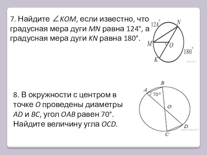 8. В окружности с центром в точке O проведены диаметры AD и BC, угол OAB равен 70°. Найдите величину угла OCD.