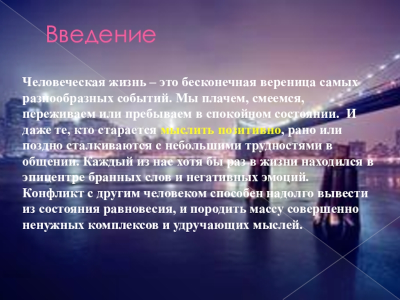 смеемся, переживаем или пребываем в спокойном состоянии. И даже те, кто старается мыслить позитивно, рано или поздно сталкиваются с небольшими трудностями в общении. Каждый из нас хотя бы раз в жизни находился в эпицентре бранных слов и негативных эмоций. Конфликт с другим человеком способен надолго вывести из состояния равновесия, и породить массу совершенно ненужных комплексов и удручающих мыслей.
