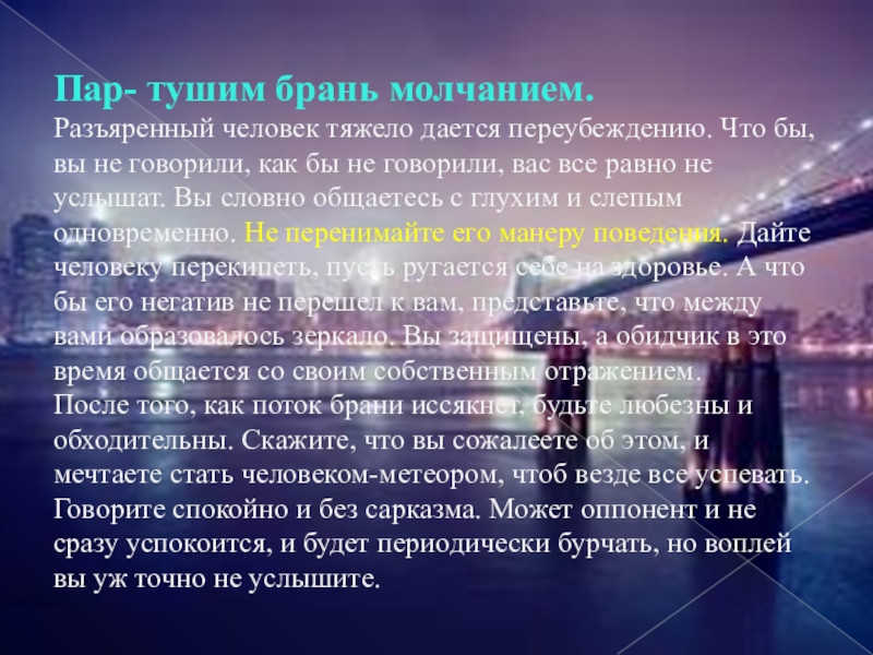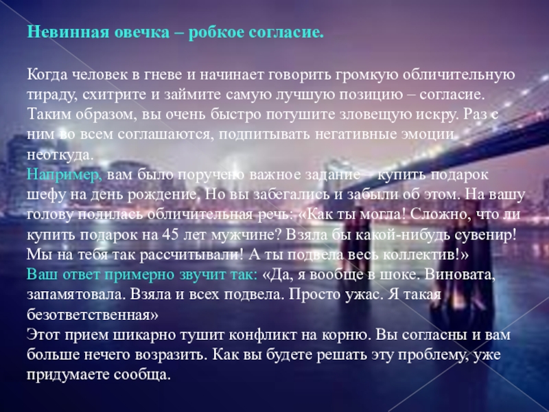 громкую обличительную тираду, схитрите и займите самую лучшую позицию – согласие. Таким образом, вы очень быстро потушите зловещую искру. Раз с ним во всем соглашаются, подпитывать негативные эмоции неоткуда.