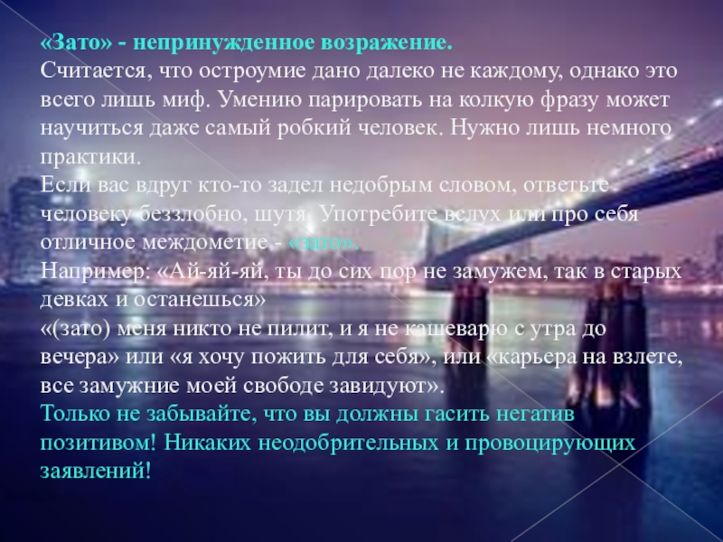 Если вас вдруг кто-то задел недобрым словом, ответьте человеку беззлобно, шутя. Употребите вслух или про себя отличное междометие - «зато».