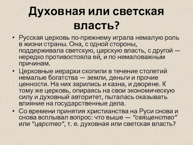 Со времени принятия христианства на Руси снова и снова всплывал вопрос: что выше — “священство”или “царство”, т. е. духовная или светская власть?