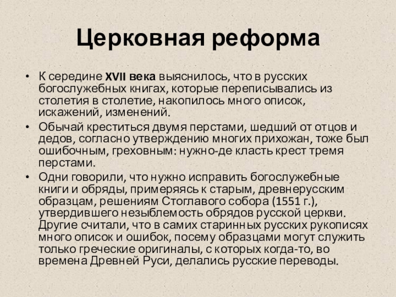 Одни говорили, что нужно исправить богослужебные книги и обряды, примеряясь к старым, древнерусским образцам, решениям Стоглавого собора (1551 г.), утвердившего незыблемость обрядов русской церкви. Другие считали, что в самих старинных русских рукописях много описок и ошибок, посему образцами могут служить только греческие оригиналы, с которых когда-то, во времена Древней Руси, делались русские переводы.