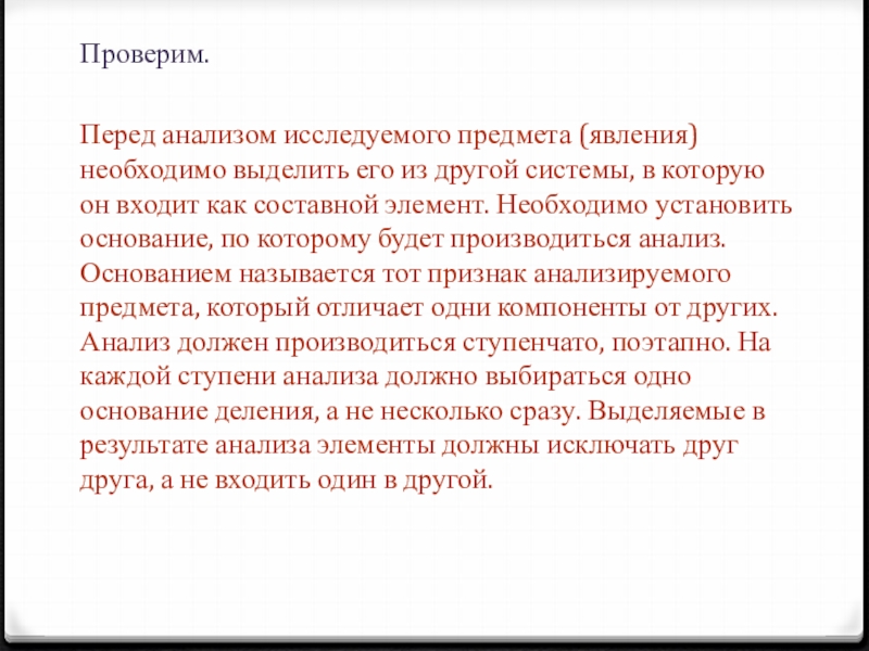 в которую он входит как составной элемент. Необходимо установить основание, по которому будет производиться анализ. Основанием называется тот признак анализируемого предмета, который отличает одни компоненты от других. Анализ должен производиться ступенчато, поэтапно. На каждой ступени анализа должно выбираться одно основание деления, а не несколько сразу. Выделяемые в результате анализа элементы должны исключать друг друга, а не входить один в другой.