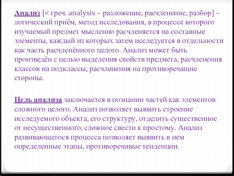 Слайд 8Анализ [< греч. analysis – разложение, расчленение, разбор] – логический приём,