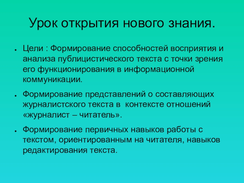 Урок открытия нового знания.Цели : Формирование способностей восприятия и анализа публицистического текста с точки зрения его функционирования в информационной коммуникации.Формирование представлений о составляющих журналистского текста в контексте отношений «журналист – читатель».Формирование первичных навыков работы с текстом,