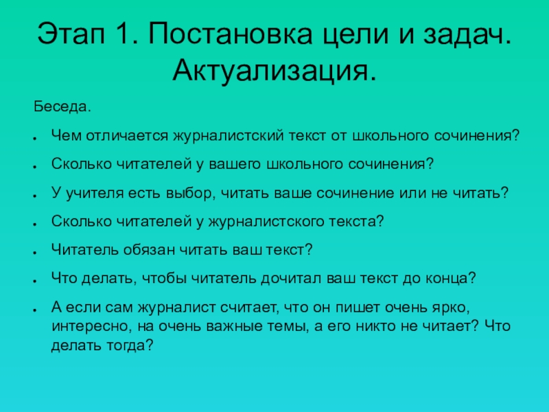 Этап 1. Постановка цели и задач. Актуализация.Беседа.Чем отличается журналистский текст от школьного сочинения?Сколько читателей у вашего школьного