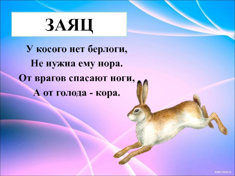 ЗАЯЦУ косого нет берлоги,Не нужна ему нора.От врагов спасают ноги,А от голода - кора.