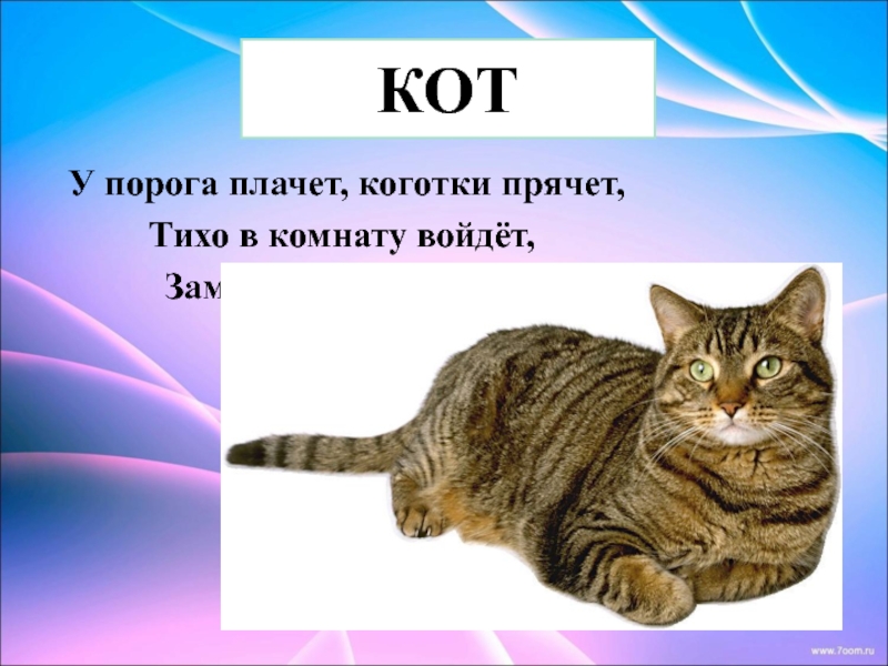 КОТ У порога плачет, коготки прячет, Тихо в комнату войдёт, Замурлычет, запоёт.