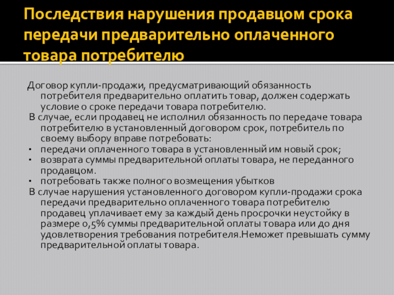Слайд 9Последствия нарушения продавцом срока передачи предварительно оплаченного товара потребителю