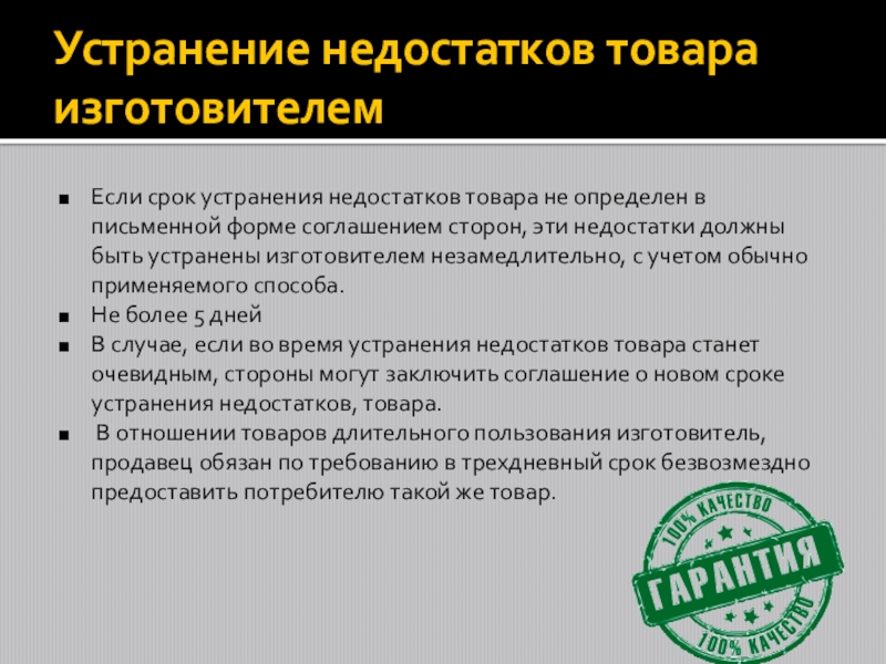 Слайд 8Устранение недостатков товара изготовителем