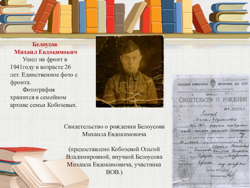 (предоставлено Кобозевой Ольгой Владимировной, внучкой Белоусова Михаила Евдокимовича, участника ВОВ.)