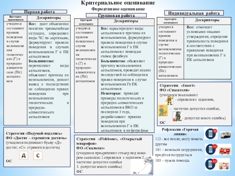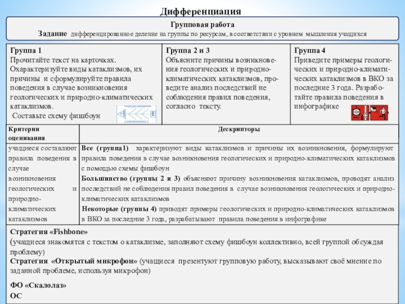 Все учащиеся охарактеризуют виды катаклизмов, составят схему фишбоун, разработают правила поведения в случае возникновения геологических и природно-климатических катаклизмов