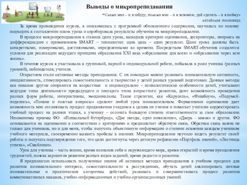 Открытием стали активные методы преподавания. С их помощью можно развивать познавательную активность, инициативность, стимулировать самостоятельность и творчество у детей разных уровней подготовки. Данные методы как никакие другие опираются на возрастные и индивидуально – психологические особенности детей, учитывают ведущие типы деятельности предыдущего и текущего этапа возрастного развития, дают возможность проведения разных форм работы, интерактивны, эмоциональны. Такие стратегии, как «Карусель», «Фишбоун», «Подумай-поделись», «Тонкие и толстые вопросы» сделают любой урок познавательным. Формативное оценивание дает возможность мне отслеживать процесс продвижения учащихся к целям их учения и помогает учителю корректировать учебный процесс на ранних этапах, а ученику – осознать большую степень ответственности за свое образование. Незаменимы приемы ФО «Похвальный бутерброд», «Две звезды, одно пожелание», «Дверь - замок» и другие. ФО основывается на оценивании в соответствии с критериями и предполагает обратную связь. Обратная связь важна не только для учеников, но и для меня, чтобы получить объективную информацию о степени освоения каждым учеником учебного материала, своевременно выявить пробелы в знаниях. Микропреподавание научило видеть результат своей работы и получать подтверждение того, что цели достигнуты через детскую рефлексию «Портфель знаний», «Лестница успеха», «Смайлики».
