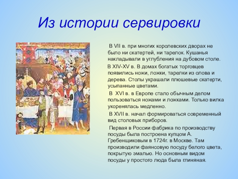 Первая в России фабрика по производству посуды была построена купцом А. Гребенщиковым в 1724г. в Москве. Там производили фаянсовую посуду белого цвета, покрытую эмалью. Но основным видом посуды у простого люда была глиняная.