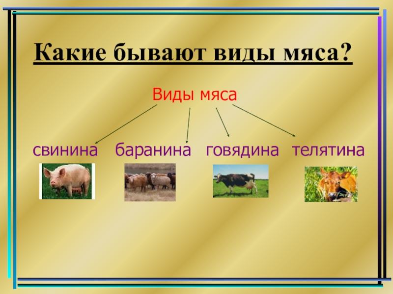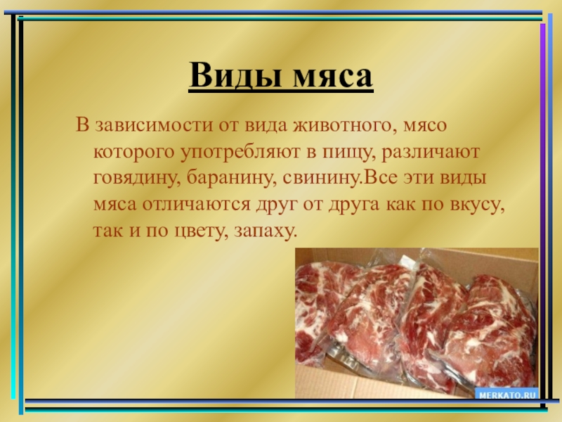 различают говядину, баранину, свинину.Все эти виды мяса отличаются друг от друга как по вкусу, так и по цвету, запаху.