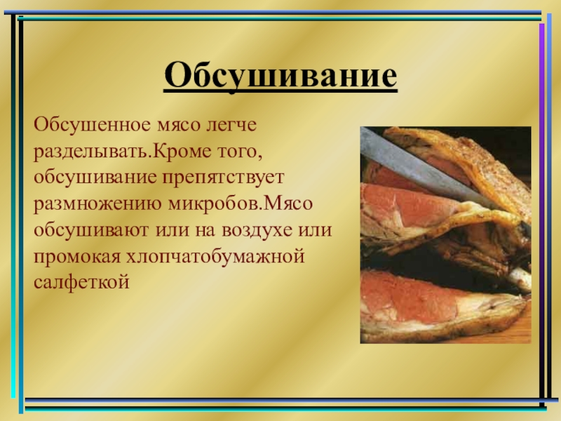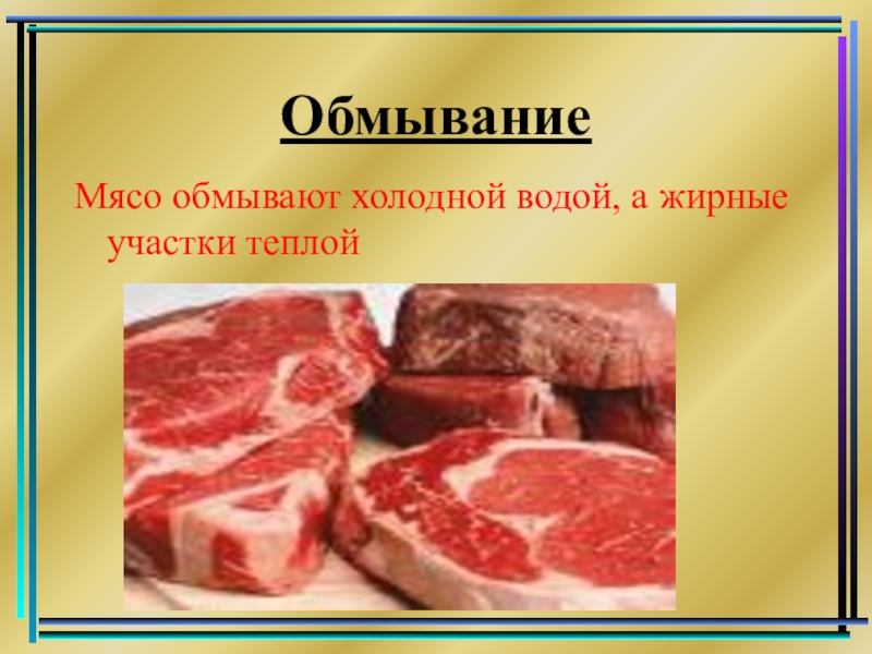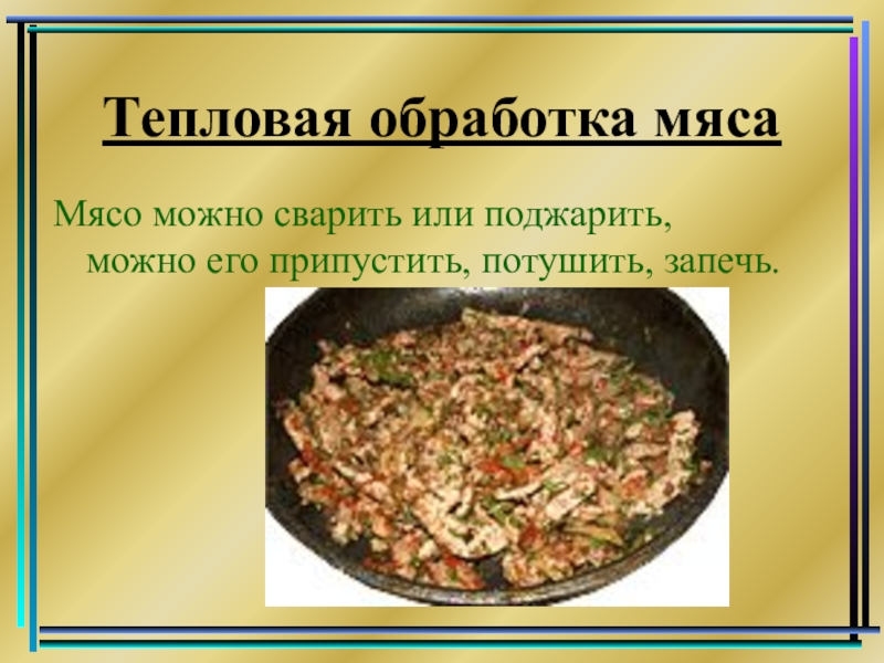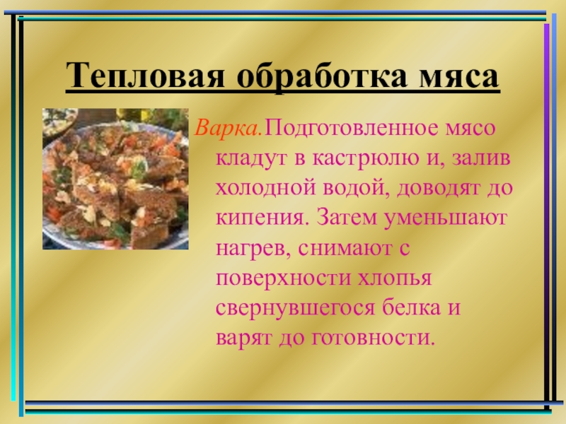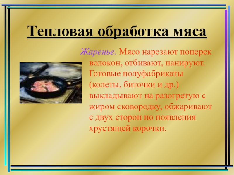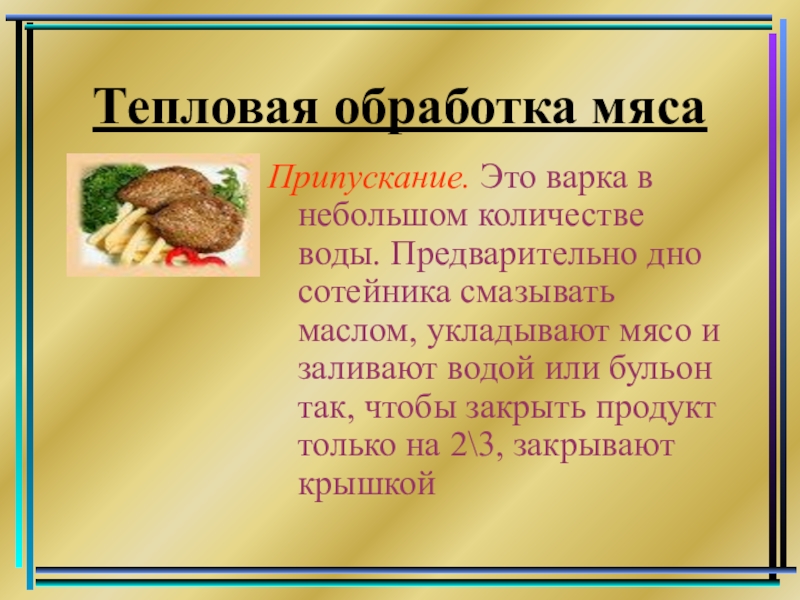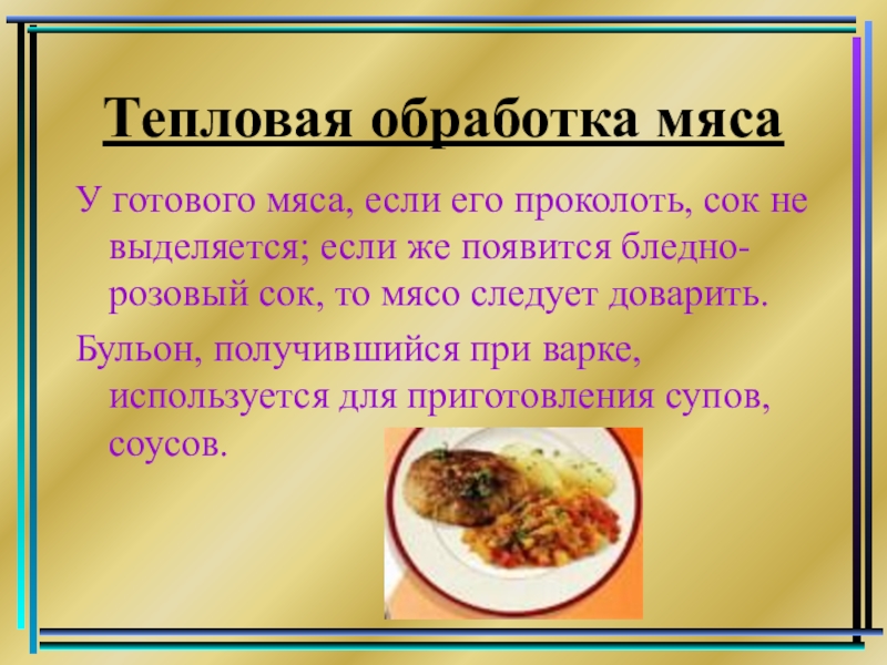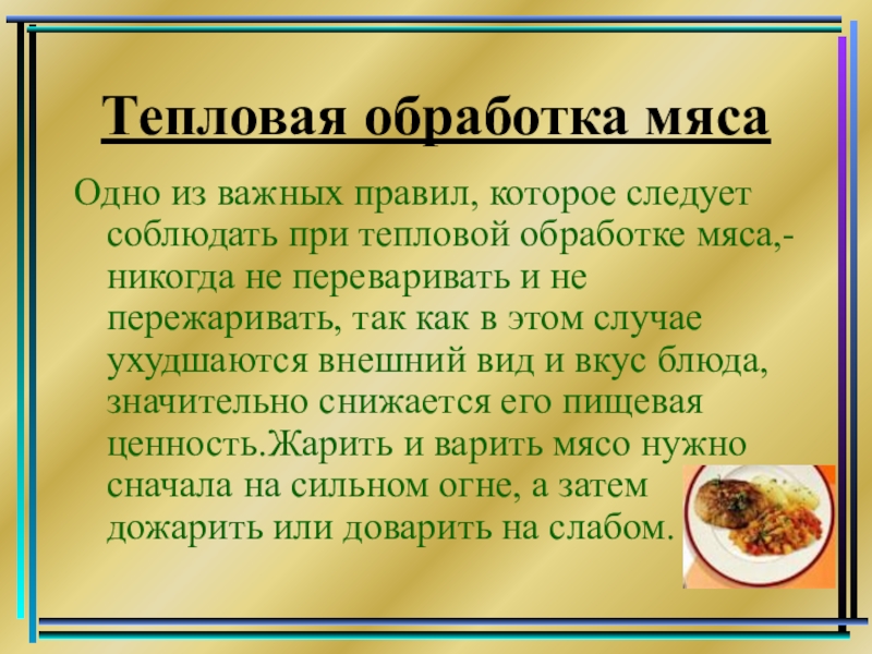 обработке мяса,- никогда не переваривать и не пережаривать, так как в этом случае ухудшаются внешний вид и вкус блюда, значительно снижается его пищевая ценность.Жарить и варить мясо нужно сначала на сильном огне, а затем дожарить или доварить на слабом.
