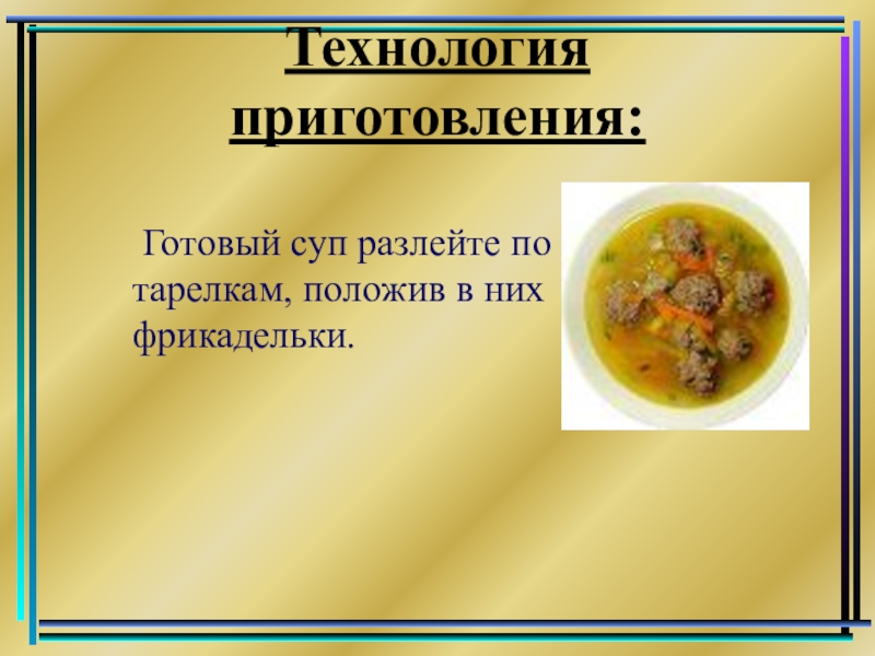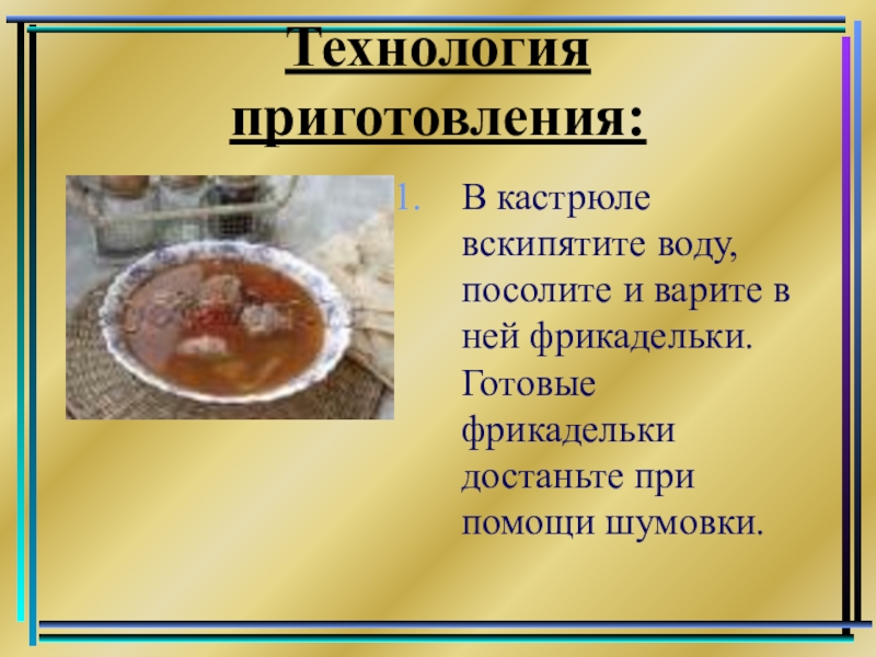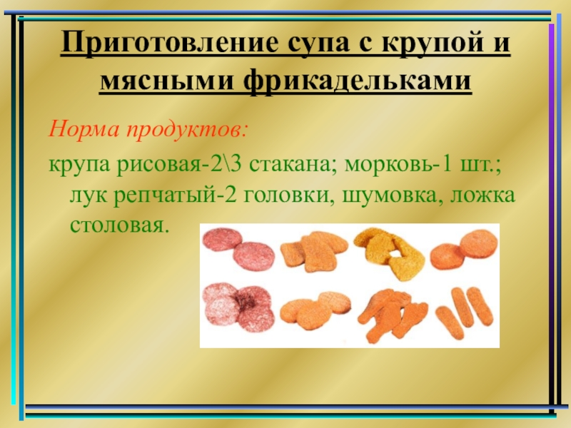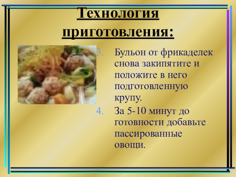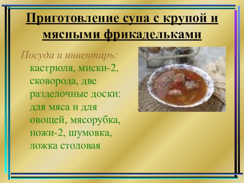 Слайд 65Приготовление супа с крупой и мясными фрикадельками