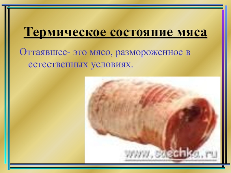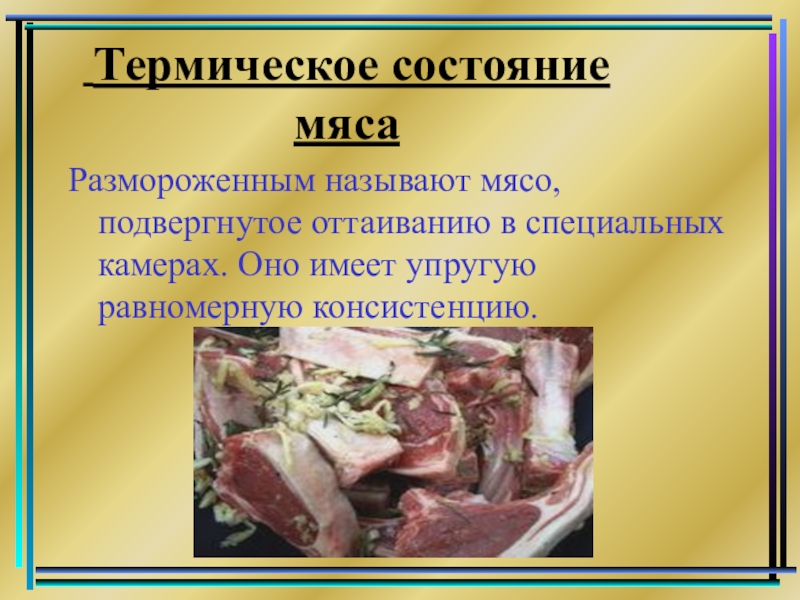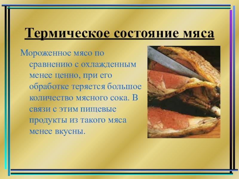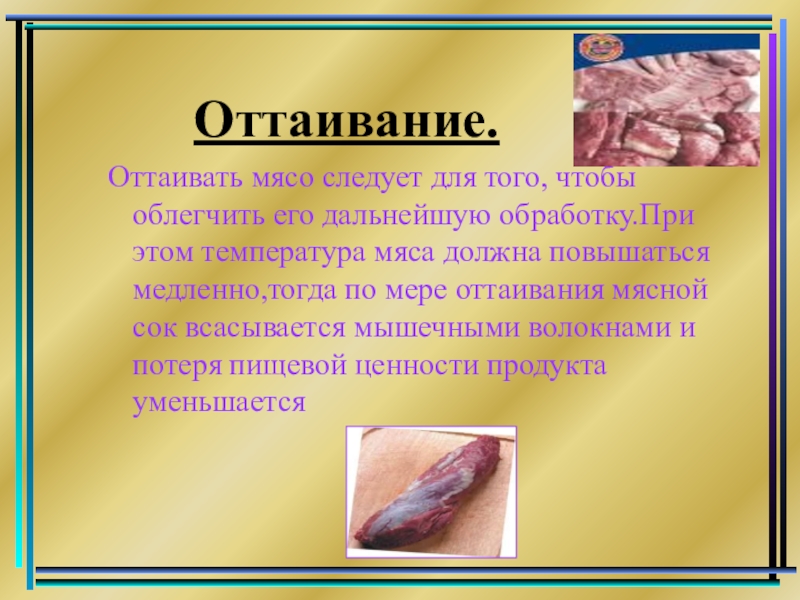 температура мяса должна повышаться медленно,тогда по мере оттаивания мясной сок всасывается мышечными волокнами и потеря пищевой ценности продукта уменьшается