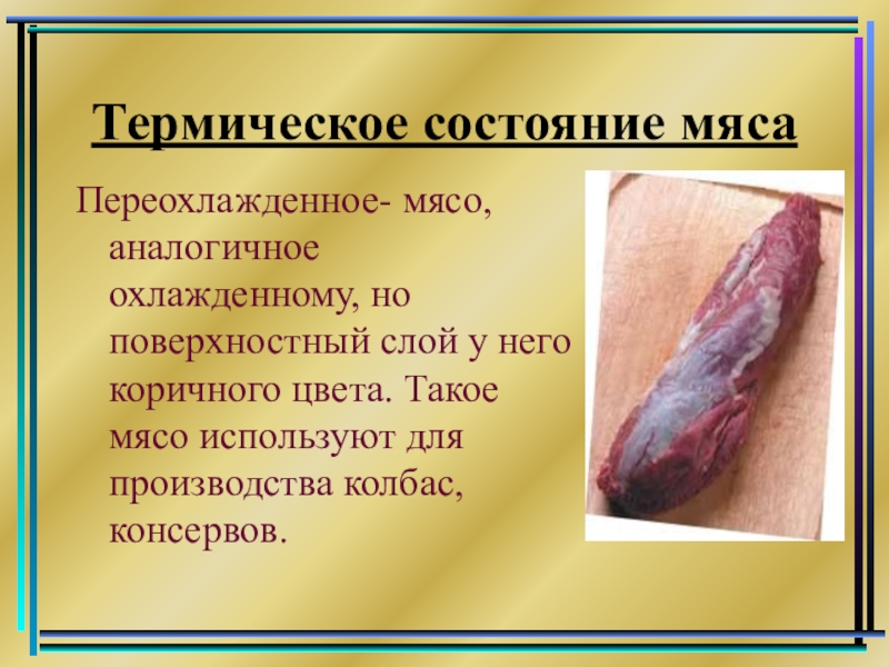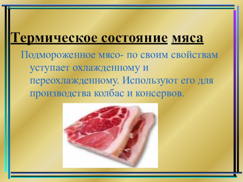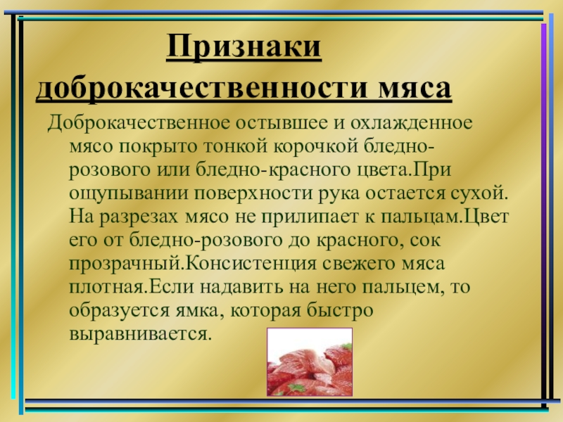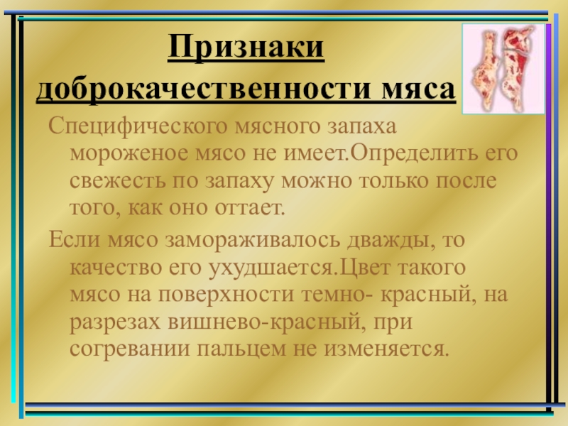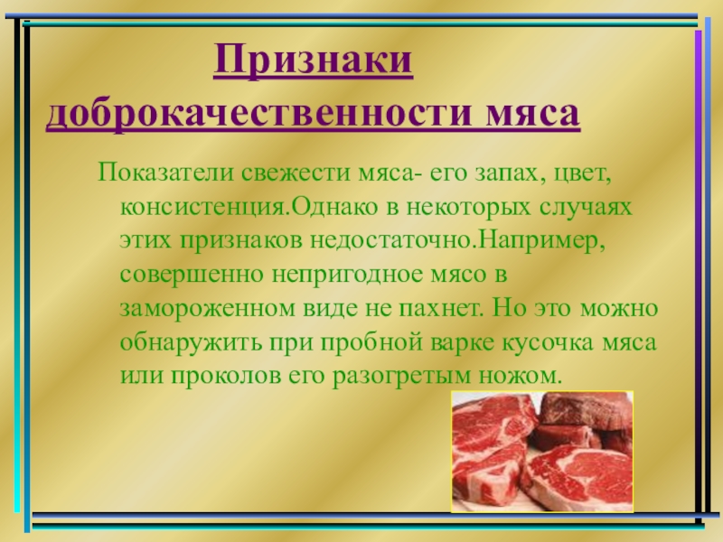 этих признаков недостаточно.Например, совершенно непригодное мясо в замороженном виде не пахнет. Но это можно обнаружить при пробной варке кусочка мяса или проколов его разогретым ножом.