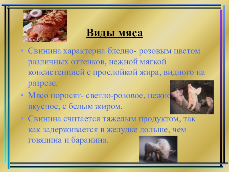 Мясо поросят- светло-розовое, нежное,вкусное, с белым жиром.