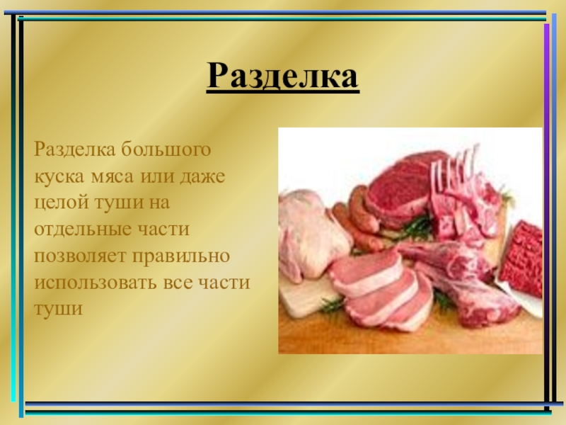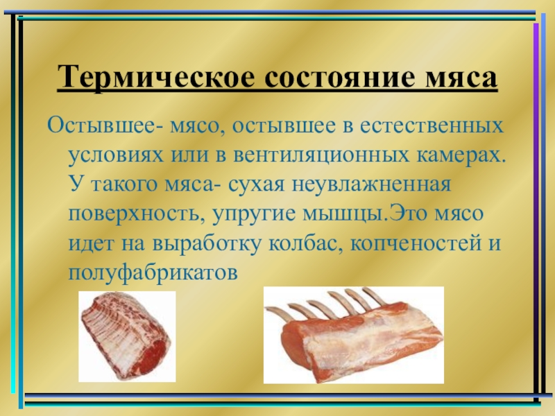 специфическая структура тканей, от чего в значительной мере зависит мягкость и нежность мяса и, следовательно, пригодность его для варки или жаренья, а также продолжительность этих процессов и вкус готового изделия.