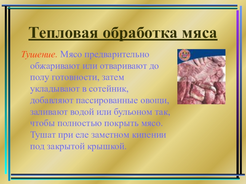 Тушение. Мясо предварительно обжаривают или отваривают до полу готовности,
