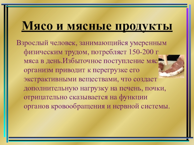г мяса в день.Избыточное поступление мяса в организм приводит к перегрузке его экстрактивными веществами, что создает дополнительную нагрузку на печень, почки, отрицательно сказывается на функции органов кровообращения и нервной системы.
