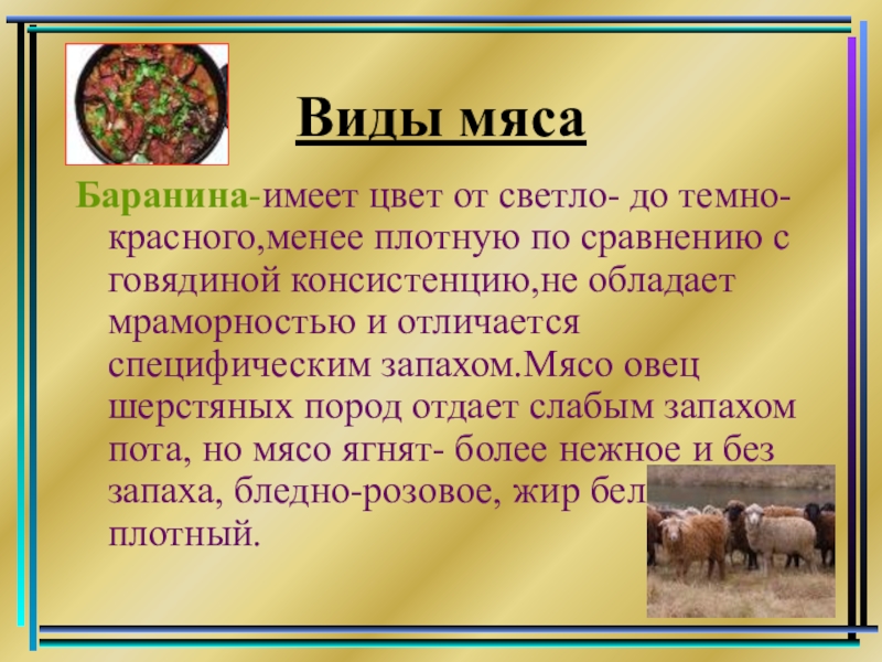говядиной консистенцию,не обладает мраморностью и отличается специфическим запахом.Мясо овец шерстяных пород отдает слабым запахом пота, но мясо ягнят- более нежное и без запаха, бледно-розовое, жир белый,плотный.