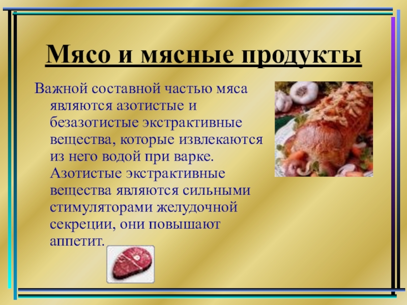 экстрактивные вещества, которые извлекаются из него водой при варке. Азотистые экстрактивные вещества являются сильными стимуляторами желудочной секреции, они повышают аппетит.