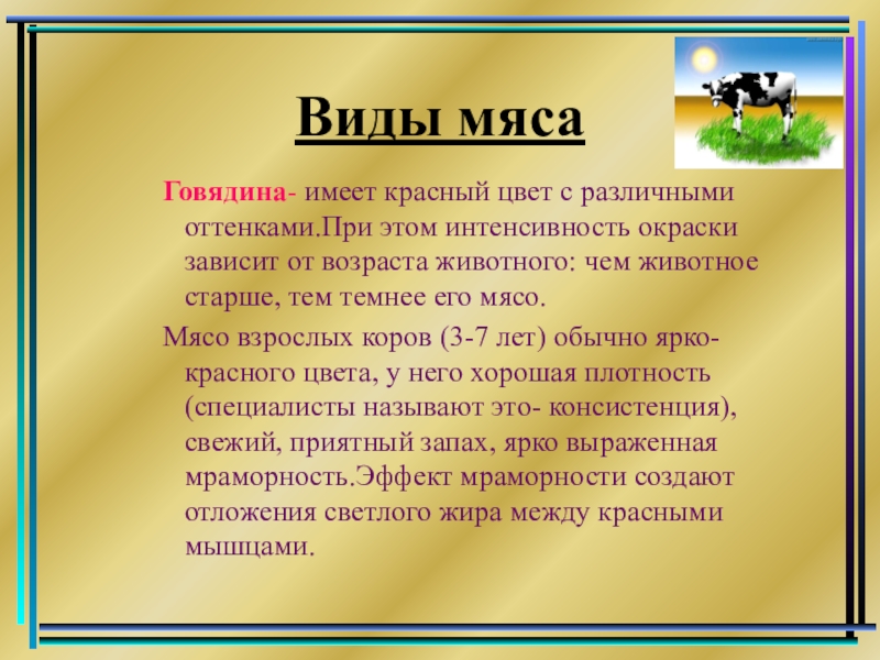 Мясо взрослых коров (3-7 лет) обычно ярко-красного цвета, у него хорошая плотность (специалисты называют это- консистенция), свежий, приятный запах, ярко выраженная мраморность.Эффект мраморности создают отложения светлого жира между красными мышцами.