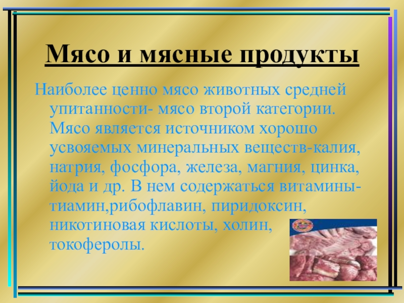 категории. Мясо является источником хорошо усвояемых минеральных веществ-калия, натрия, фосфора, железа, магния, цинка, йода и др. В нем содержаться витамины-тиамин,рибофлавин, пиридоксин, никотиновая кислоты, холин, токоферолы.