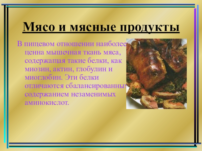 содержащая такие белки, как миозин, актин, глобулин и миоглобин. Эти белки отличаются сбалансированным содержанием незаменимых аминокислот.