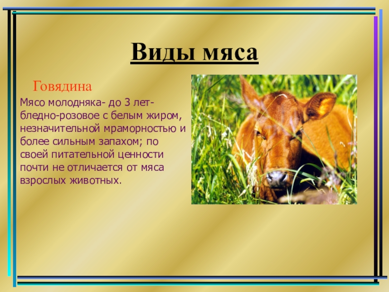 мраморностью и более сильным запахом; по своей питательной ценности почти не отличается от мяса взрослых животных.