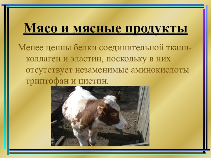 кислоты, поэтому они тугоплавкие. Большое количество жира в мясе обусловливает уменьшение содержания белков, однако жир мяса тощего скота обладает меньшей биологической ценностью и характеризуются меньшей усвояемостью.
