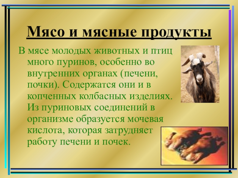 особенно во внутренних органах (печени, почки). Содержатся они и в копченных колбасных изделиях. Из пуриновых соединений в организме образуется мочевая кислота, которая затрудняет работу печени и почек.