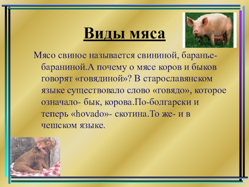 и быков говорят «говядиной»? В старославянском языке существовало слово «говядо», которое означало- бык, корова.По-болгарски и теперь «hovado»- скотина.То же- и в чешском языке.