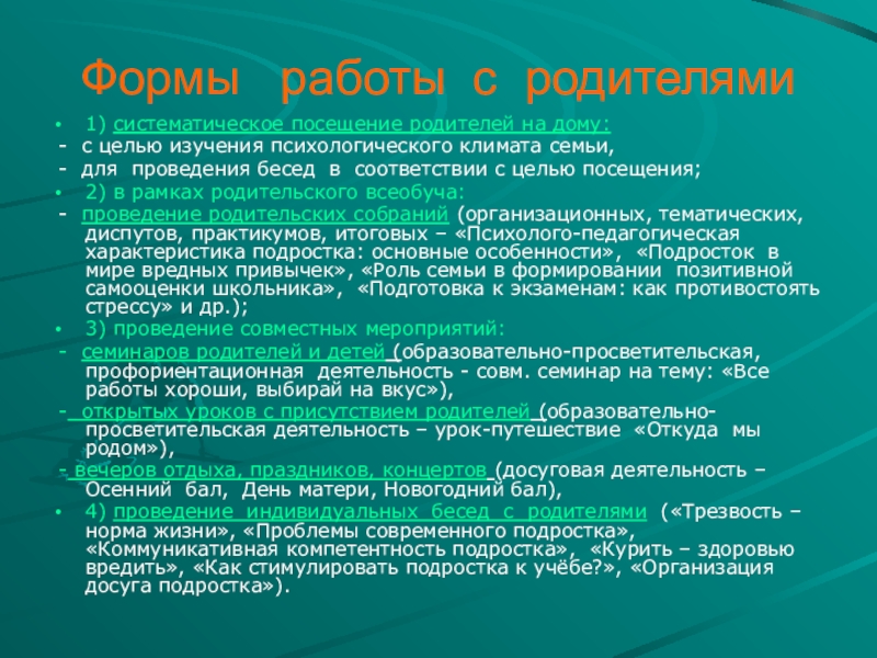 4) проведение индивидуальных бесед с родителями («Трезвость – норма жизни», «Проблемы современного подростка», «Коммуникативная компетентность подростка», «Курить – здоровью вредить», «Как стимулировать подростка к учёбе?», «Организация досуга подростка»).