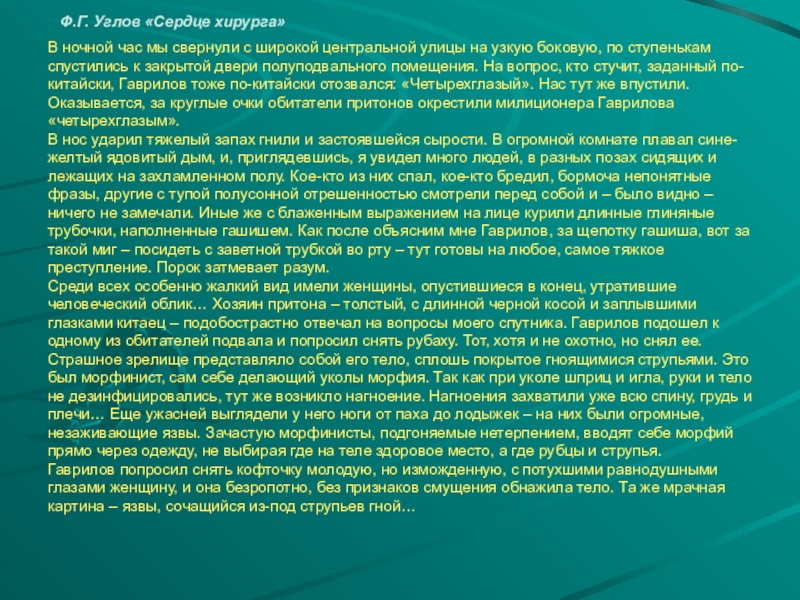 Среди всех особенно жалкий вид имели женщины, опустившиеся в конец, утратившие человеческий облик… Хозяин притона – толстый, с длинной черной косой и заплывшими глазками китаец – подобострастно отвечал на вопросы моего спутника. Гаврилов подошел к одному из обитателей подвала и попросил снять рубаху. Тот, хотя и не охотно, но снял ее. Страшное зрелище представляло собой его тело, сплошь покрытое гноящимися струпьями. Это был морфинист, сам себе делающий уколы морфия. Так как при уколе шприц и игла, руки и тело не дезинфицировались, тут же возникло нагноение. Нагноения захватили уже всю спину, грудь и плечи… Еще ужасней выглядели у него ноги от паха до лодыжек – на них были огромные, незаживающие язвы. Зачастую морфинисты, подгоняемые нетерпением, вводят себе морфий прямо через одежду, не выбирая где на теле здоровое место, а где рубцы и струпья.